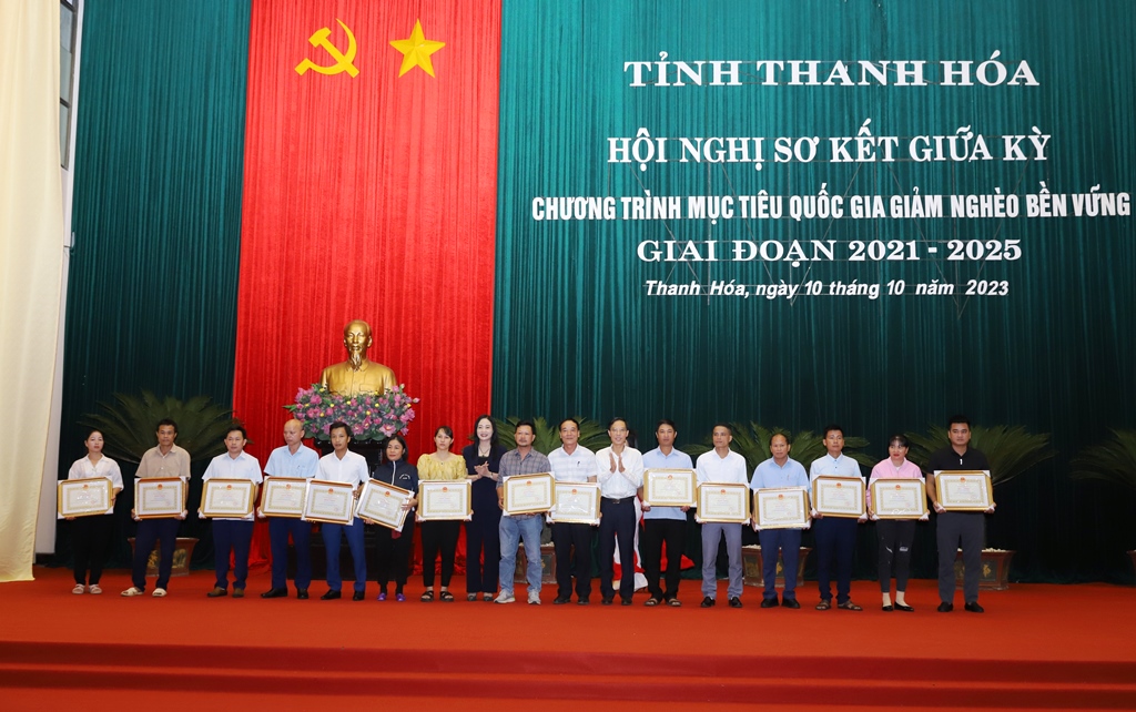 Tại hội nghị, đồng chí Đỗ Trọng Hưng - Ủy viên Trung ương Đảng, Bí thư Tỉnh ủy, Chủ tịch HĐND tỉnh, Trưởng Ban Chỉ đạo thực hiện các CTMTQG tỉnh giai đoạn 2021-2025; các đồng chí lãnh đạo tỉnh đã trao Bằng khen của Chủ tịch UBND tỉnh cho 44 tập thể, 26 cá nhân, 17 hộ gia đình đã có nhiều thành tích trong thực hiện phong trào thi đua “Vì người nghèo - Không để ai bị bỏ lại phía sau” giai đoạn 2021- 2023.