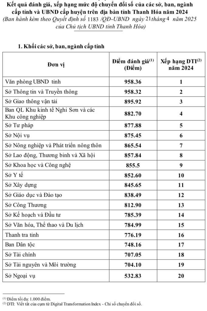Trên cơ sở đó, có 5 đơn vị cấp sở, ban, ngành xếp đầu cấp sở về Bộ chỉ số đánh giá, xếp hạng mức độ chuyển đổi số (DTI) năm 2024 là: Văn phòng UBND tỉnh (958.36 điểm), Sở Thông tin và Truyền thông (958.32 điểm), Sở Giao thông vận tải (895.92 điểm), Ban QL Khu kinh tế Nghi Sơn và các Khu công nghiệp (882.70 điểm), Sở Tư pháp (877.88 điểm).
