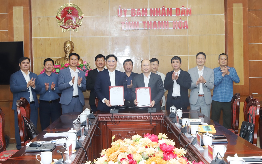 | Đại diện lãnh đạo hai đơn vị: UBND tỉnh Thanh Hóa và Trường Đại học Lâm nghiệp ký kết Thỏa thuận hợp tác. |