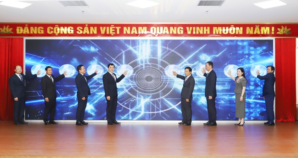 | Các đồng chí lãnh đạo tỉnh và các đại biểu thực hiện nghi thức ấn nút chính thức vận hành Trung tâm IOC tỉnh. |